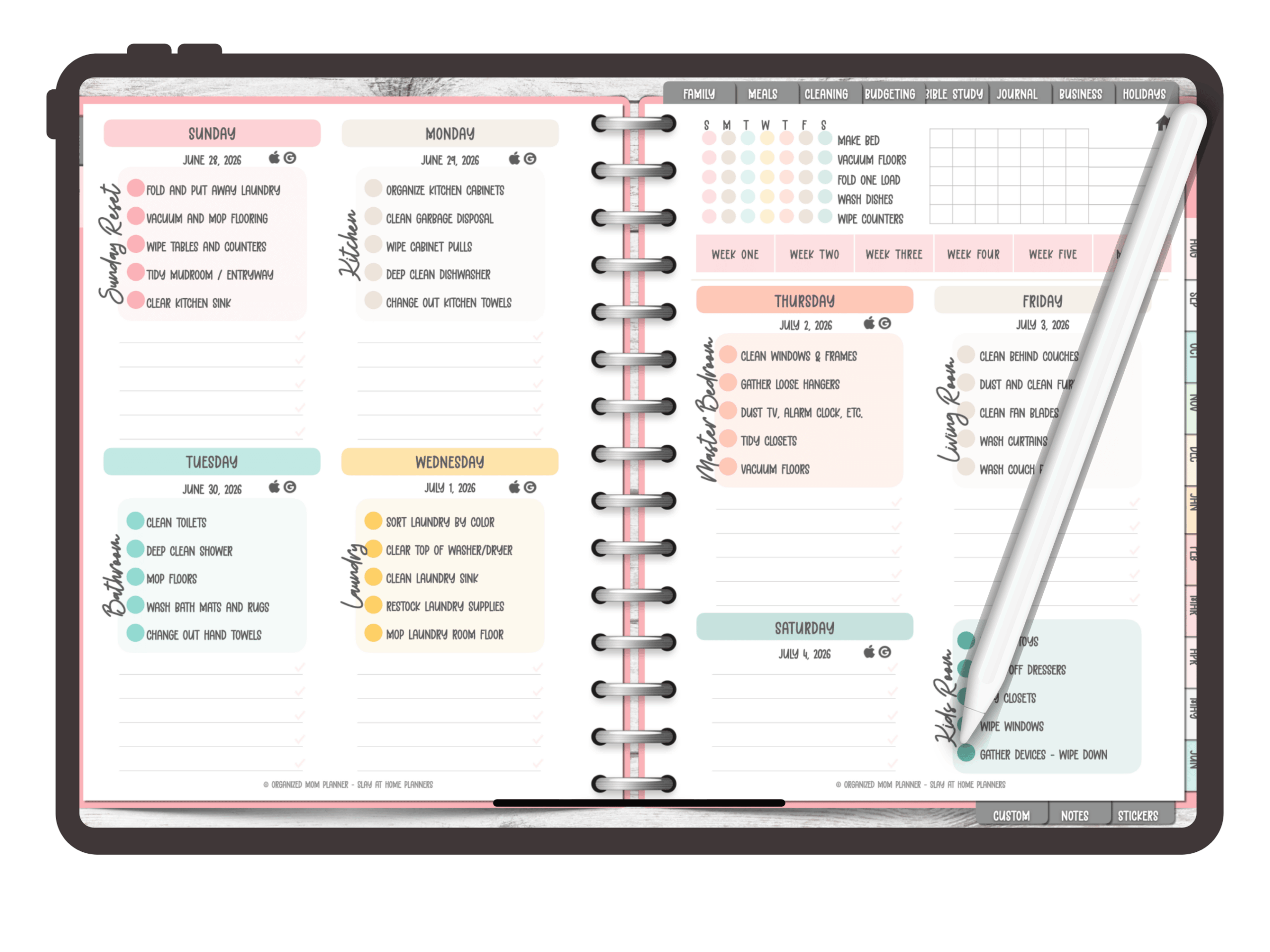 On the Weekly Pages, you'll find each day broken down with your daily cleaning tasks to easily follow along and check off.